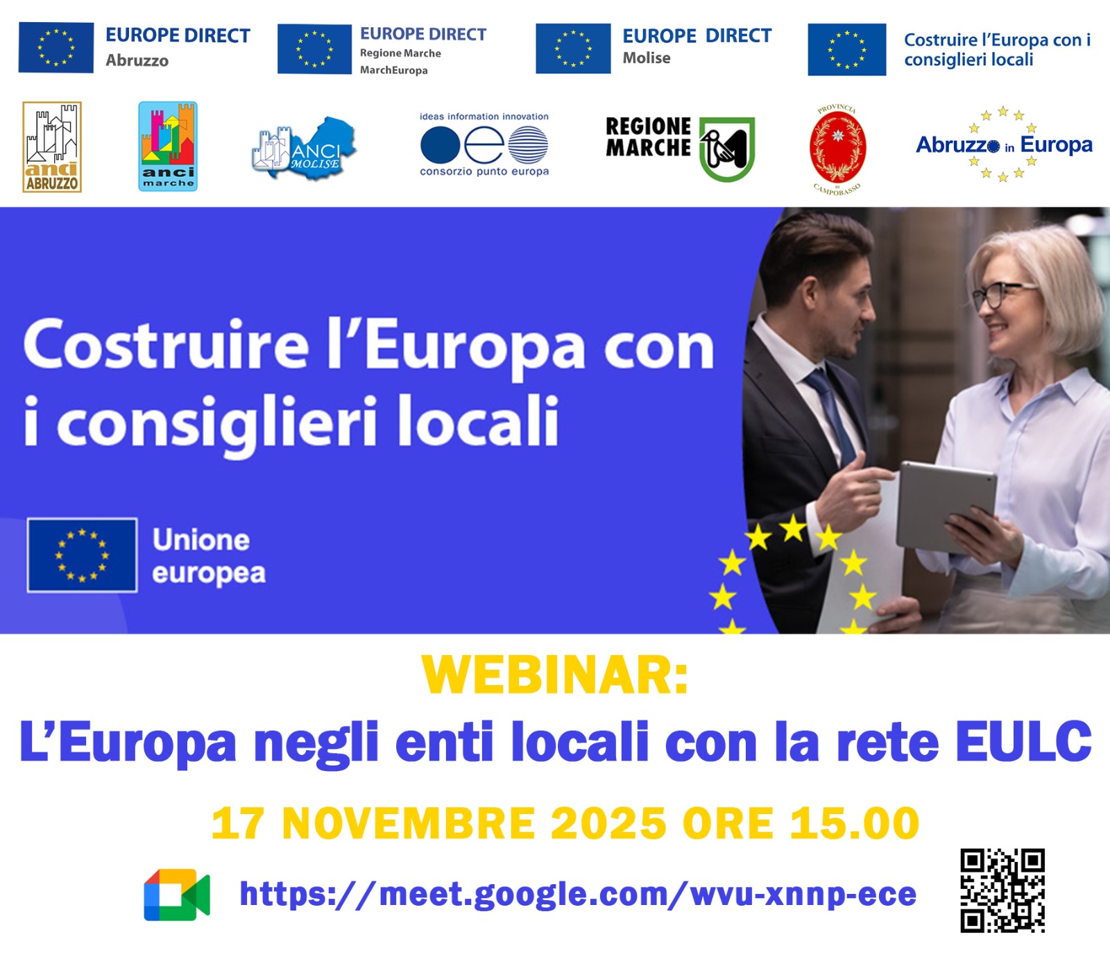 Webinar “ Costruire l’Europa con i Consiglieri locali ” (la rete EULC) Lunedì 17 novembre 2025 ore 15.00 piattaforma MEET - Link per il collegamento: https://meet.google.com/wvu-xnnp-ece Organizzato d...