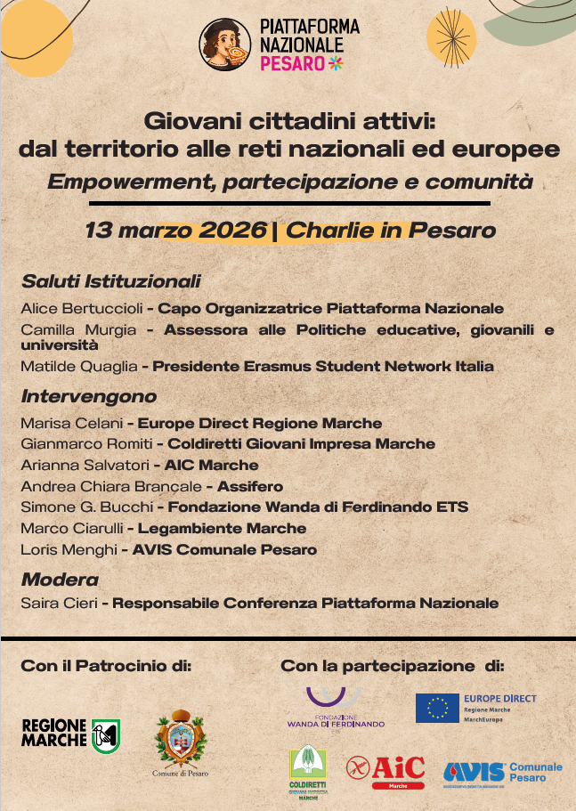 Grazie ai patrocini della Regione Marche e del Comune di Pesaro e con il supporto delle realtà istituzionali e associative del territorio (tra cui Europe Direct Regione Marche), la città di Pesaro si prepara ad accogliere un importante momento di dialogo tra giovani, istituzioni e reti del terzo settore.